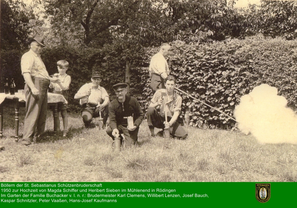 Das Böllerschießen hat auch in der Schützenbruderschaft Rödingen eine Tradition. Zeitzeugen und auch Unterlagen belegen, dass anlässlich von Festen wie Pfingsten, Fronleichnam, Schützenfest, Weißen- oder Jubiläums-Hochzeiten, besonderen Geburts-, Ehren- oder Jubiläums-Tagen in Rödingen geböllert wurde. Auf dem Bild ist festgehalten, wie 1950 zur Hochzeit von Magda Schiffer und Heribert Sieben im Mühlenend in Rödingen im Garten der damaligen Familie Buchacker geböllert wurde.