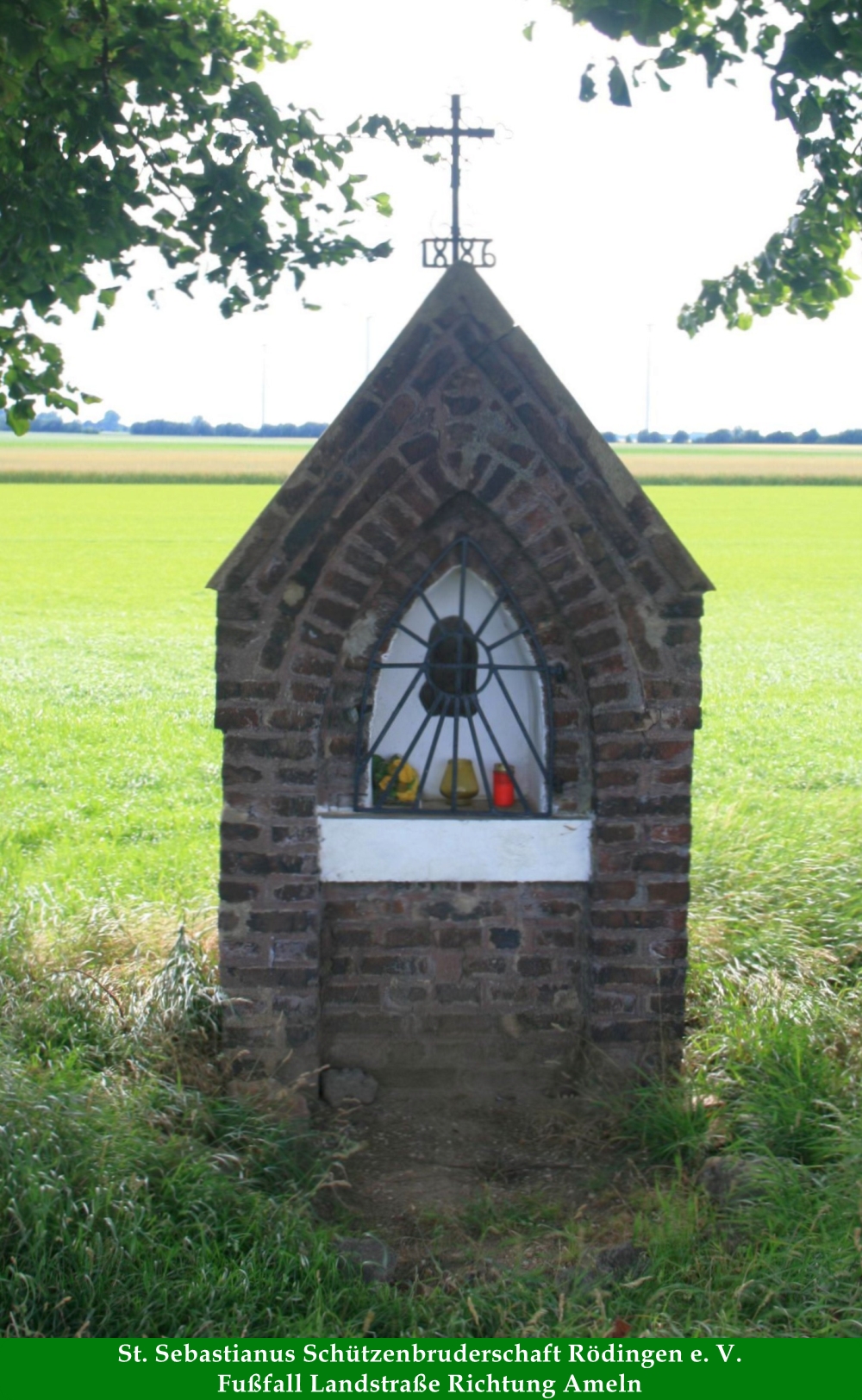 Inschriftliche Datierung 1886; Heiligenhäuschen aus Backstein mit spitzbogiger Nische und dachförmigen Abschluss, von schmiedeeisernem Kreuz mit Jahreszahl bekrönt. (Quelle: http://de.wikipedia.org)