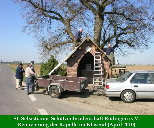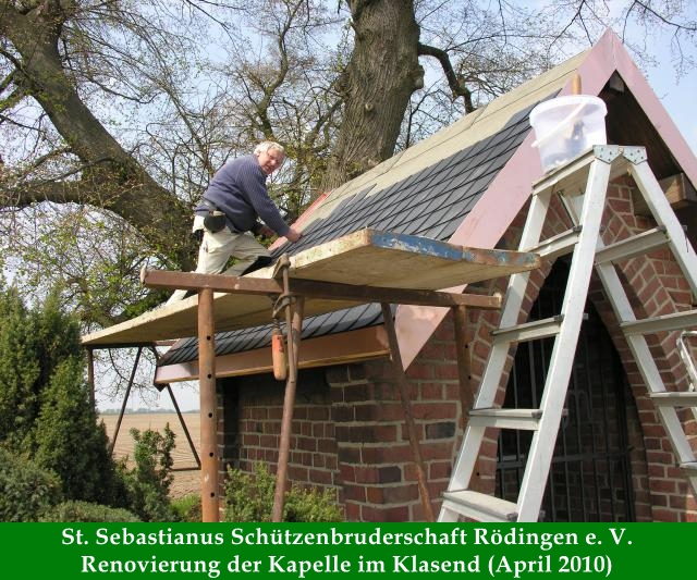 Am 21. April begann die Dachsanierung der Kapelle im Klasend durch die Schützen Dieter Breuer, Heinz, Breuer, Gebhard Gerken, Karl Remus, Hans-Gerd Clemens, Manfred Abels, Volker Lenzen und Michael Gerken. Schnell wurden unter dem Bauleiter Dieter Breuer die alten Schieferplatten entfern und die Dachkonstruktion von Nägeln und Teerpappe befreit. Neben den neuen Schieferplatten wurden der First, der Ortgang und auch die Traufe in Kupfer ausgeführt, was die Haltbarkeit der Sanierung sicher um einiges verlängert. Auch wurden die Fugen auf der Wetterseite Richtung Güsten ausgebessert. Die Pflege der Kappel und des Grundstücks haben Inge und Dieter Breuer übernommen und die Schützenbruderschaft ist dankbar für dieses Engagement.