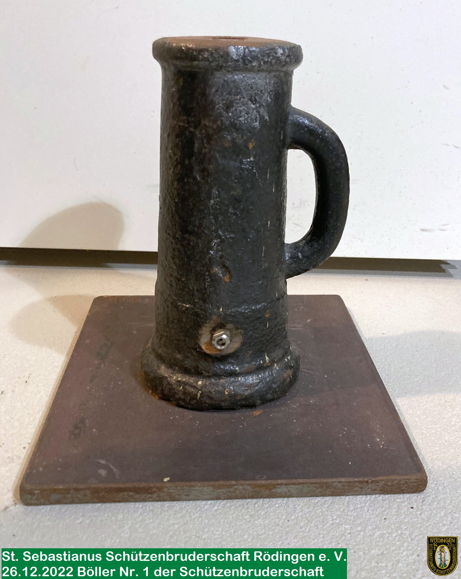 Die alten gusseisernen Böller – auch Katzenköppe genannt - muten mit dem Haltegriff fast wie ein Bierkrug an. Ein solcher ist auch oben auf dem Bild von 1950 zu sehen. Die neuen Böller sind aus glänzendem Edelstahl gefertigt und zu dritt auf einem Holzbalken befestigt.