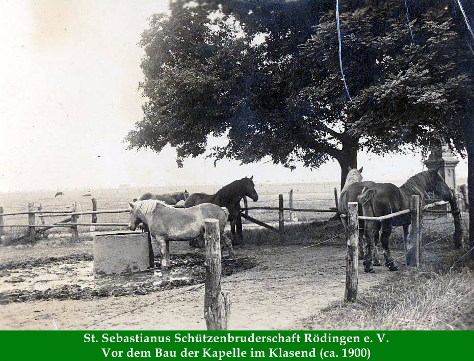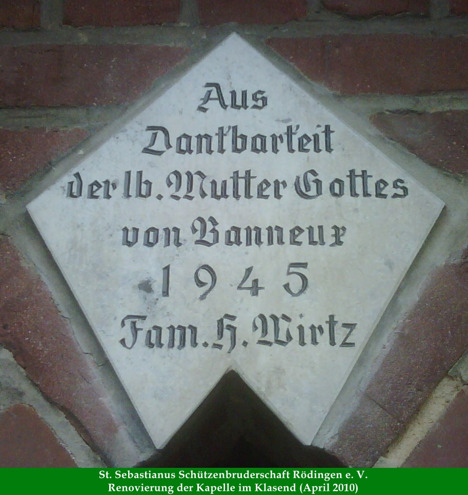 Wer Rödingen in Richtung Güsten verlässt, fährt über die Straße "Klasend" geradewegs auf die Kapelle zu. Erst unmittelbar an der Kapelle knickt die Straße links ab. Über dem Torbogen ist eine Platte mit folgender Inschrift eingesetzt: "Aus Dankbarkeit der lb. Mutter Gottes von Banneux 1945 Fam. H. Wirtz" (siehe http://de.wikipedia.org/wiki/Banneux). Der Hof der Familie Wirtz wurde in den Kriegsjahre vor der Zerstörung verschont und aus Dankbarkeit wurde ca. 1950 von der Familie Wirtz die Kapelle erbaut. Später wurde diese an die Pfarrgemeinde St. Cornelius Rödingen übergeben.