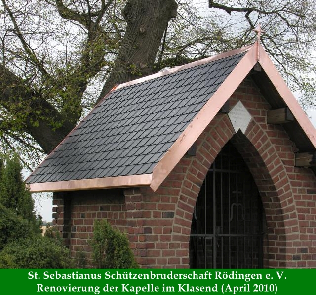 Am 21. April begann die Dachsanierung der Kapelle im Klasend durch die Schützen Dieter Breuer, Heinz, Breuer, Gebhard Gerken, Karl Remus, Hans-Gerd Clemens, Manfred Abels, Volker Lenzen und Michael Gerken. Schnell wurden unter dem Bauleiter Dieter Breuer die alten Schieferplatten entfern und die Dachkonstruktion von Nägeln und Teerpappe befreit. Neben den neuen Schieferplatten wurden der First, der Ortgang und auch die Traufe in Kupfer ausgeführt, was die Haltbarkeit der Sanierung sicher um einiges verlängert. Auch wurden die Fugen auf der Wetterseite Richtung Güsten ausgebessert. Die Pflege der Kappel und des Grundstücks haben Inge und Dieter Breuer übernommen und die Schützenbruderschaft ist dankbar für dieses Engagement.